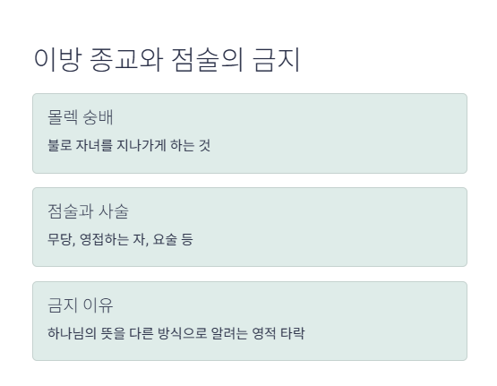 - 불로 자녀를 지나가게 하는 것(몰렉 숭배), 점술, 사술, 무당, 영접하는 자, 요술 등은 철저히 금지됩니다.