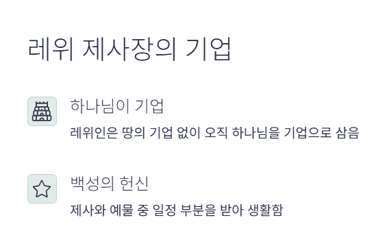 • 레위인은 기업이 없이 오직 하나님을 기업으로 삼으며, 백성의 제사와 예물 중 일정 부분을 받아 생활합니다.