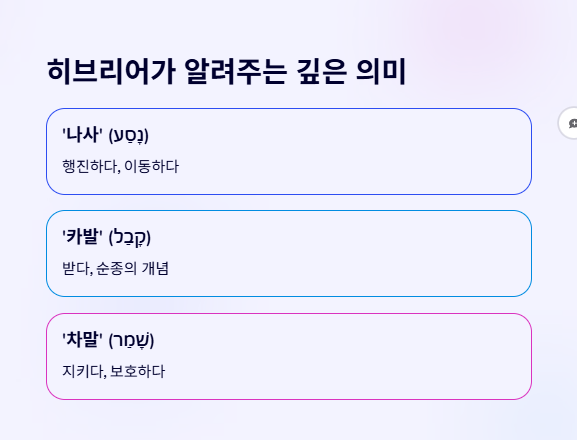- ‘카발’ (קָבַל) – 받다. 하나님의 명령을 받아 행하는 순종의 개념.
