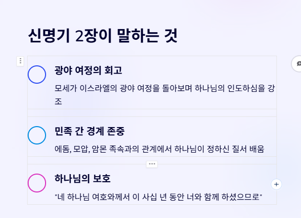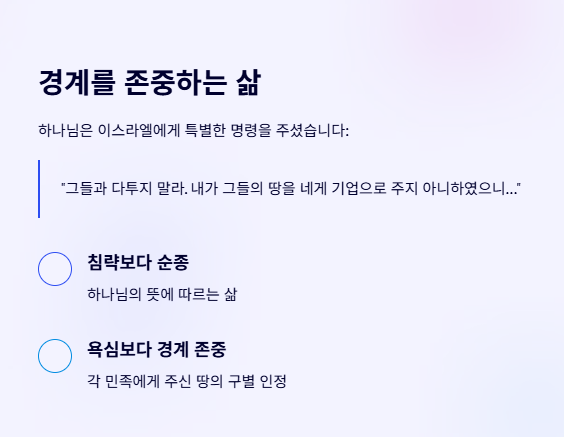 특히 에돔, 모압, 암몬 족속과의 관계를 통해 하나님께서 정하신 구별과 질서를 존중하는 태도를 배우게 합니다.