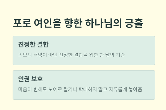 • 전쟁 후 포로 여인을 아내로 삼으려 할 때, 외모의 욕망이 아닌 진정한 결합을 위한 기간(한 달)을 가지게 함.