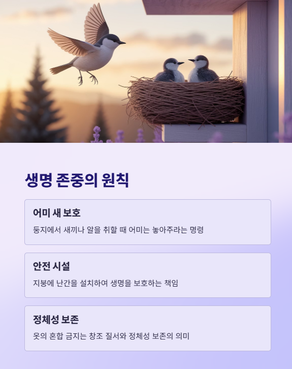 - 둥지에서 새끼나 알을 취할 때, 어미는 놓아주라는 명령은 생명을 경외하고 자비를 베푸는 하나님의 성품을 본받으라는 교육입니다.