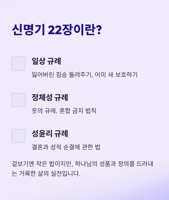 - 성적인 순결, 정결함, 거짓 고발에 대한 처벌 등은 결혼과 가족, 공동체의 거룩함을 지키기 위한 질서입니다.
