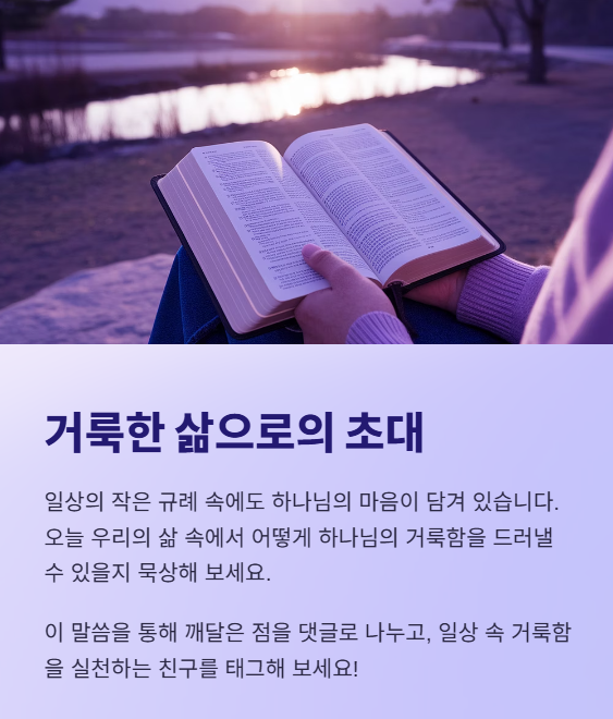 오늘 우리도 작은 실천 속에 하나님의 성품을 드러낼 수 있음을 잊지 말아야 합니다.