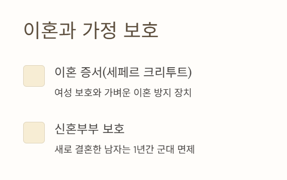 - 새로 결혼한 자는 1년간 전쟁에 나가지 않게 하여 가정의 안정과 사랑을 우선시함.