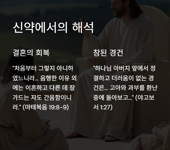 예수님은 이혼에 대해 더욱 엄격한 기준을 제시하시며, 창조 질서 안에서 결혼의 본질을 회복하셨습니다.