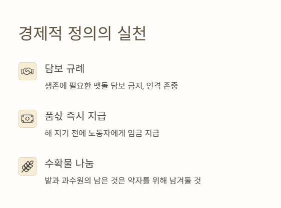 - 가난한 품꾼의 임금을 하루해가 지기 전에 주라는 명령은 노동자의 생계를 위한 시급성을 반영.