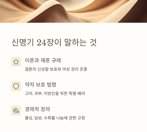 신명기 24장은 이혼 후 재혼 금지, 담보 규례, 고용인 보호, 이방인과 고아, 과부를 위한 자비의 명령 등을 통해, 하나님 백성 공동체가 정의와 긍휼을 실천하는 삶의 자세를 가져야 함을 강조합니다.