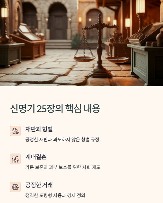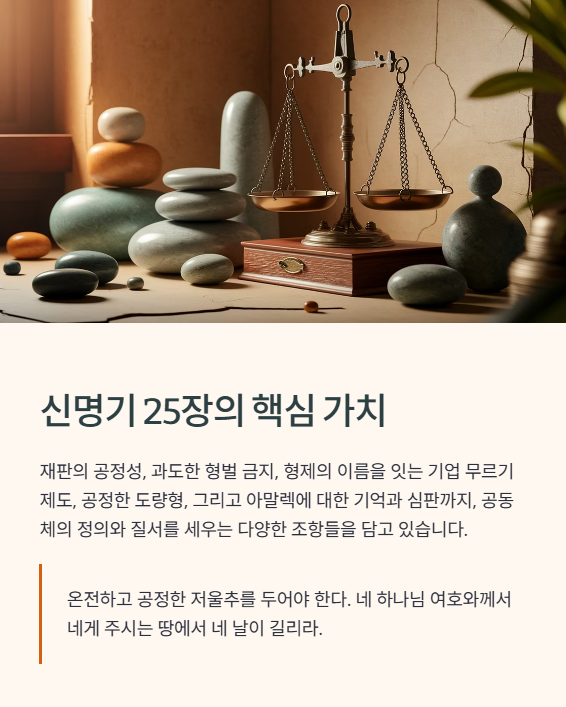 신명기 25장은 재판의 공정성, 과도한 형벌 금지, 형제의 이름을 잇는 기업 무르기 제도, 공정한 도량형, 그리고 아말렉에 대한 기억과 심판까지, 공동체의 정의와 질서를 세우는 다양한 조항들을 담고 있습니다.