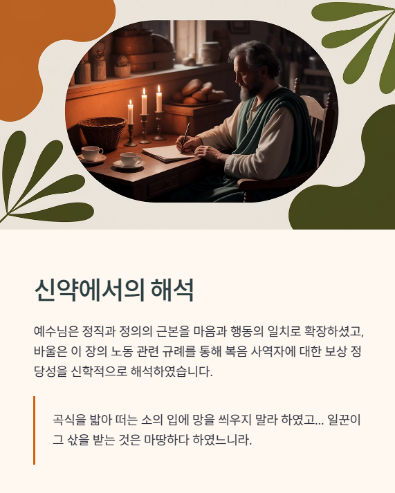 바울은 이 장의 노동 관련 규례를 통해 복음 사역자에 대한 보상 정당성을 신학적으로 해석하였습니다.