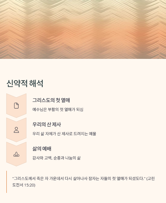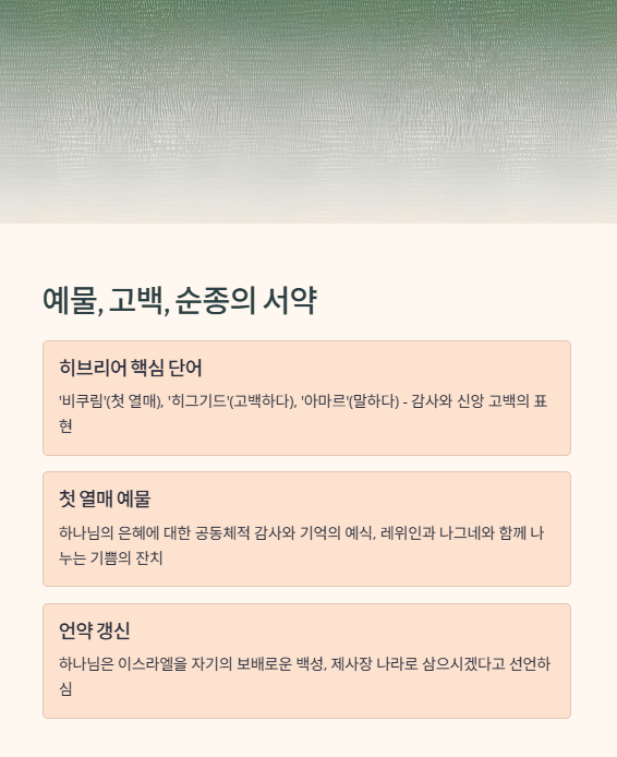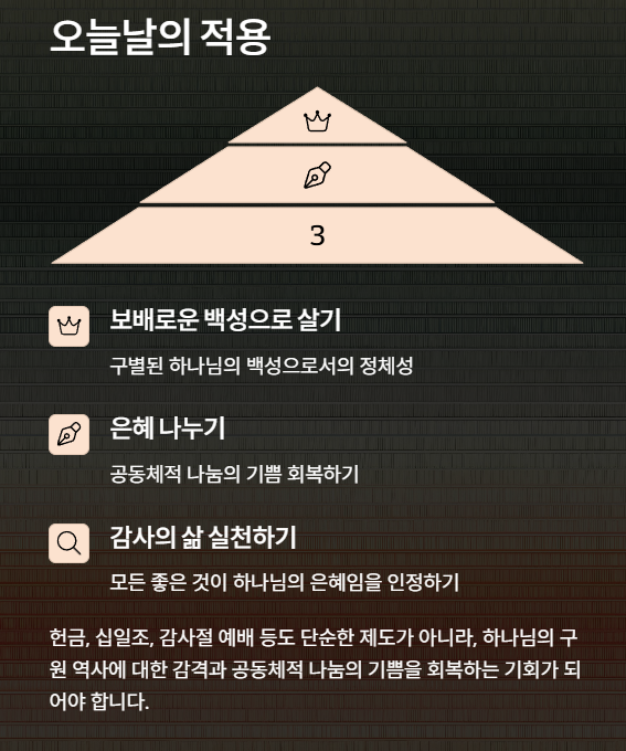단지 형식적인 예물이 아닌, 하나님과의 관계를 재확인하고 공동체적 기쁨을 회복하는 삶의 실천으로 나타납니다.
