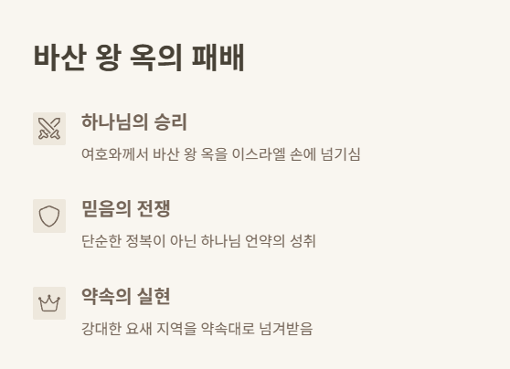 바산은 강대한 옥 왕이 다스리는 요새 지역이었지만, 하나님께서는 그 땅을 이스라엘에게 약속의 성취로써 넘기십니다.