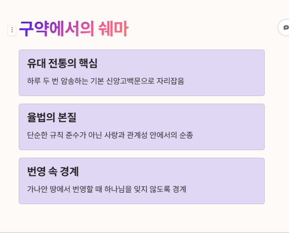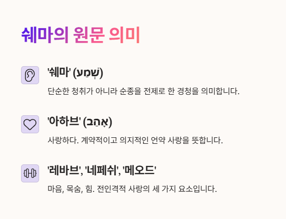 - ‘쉐마’ (שְׁמַע) – 들으라. 단순한 청취가 아니라 순종을 전제로 한 경청.