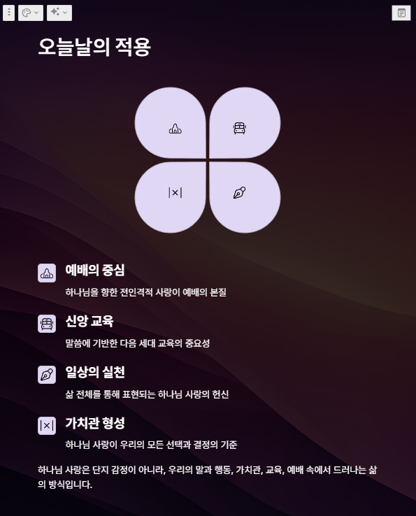 우리는 하나님을 단지 믿는 것이 아니라, 사랑해야 하며, 그 사랑이 말과 행동, 가치관, 교육, 예배 속에서 드러나야 합니다.