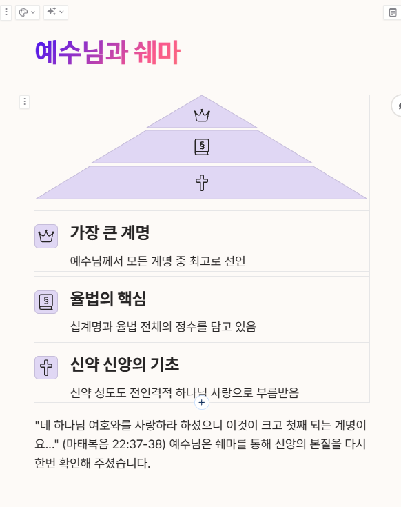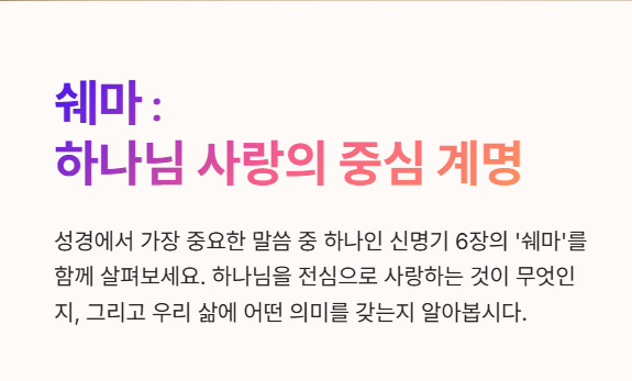 예수님은 이 쉐마의 말씀을 **“가장 큰 계명”**으로 선포하셨습니다.