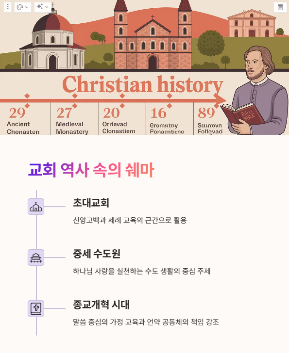 초대교회는 쉐마를 신앙고백과 세례 교육의 근간으로 삼았고, 중세 수도원 영성은 하나님 사랑을 실천하는 수도 생활의 중심 주제로 삼았습니다.