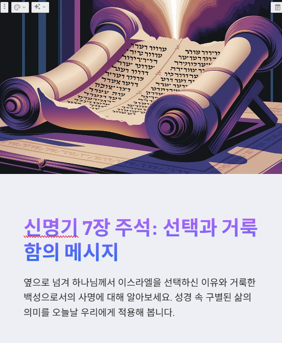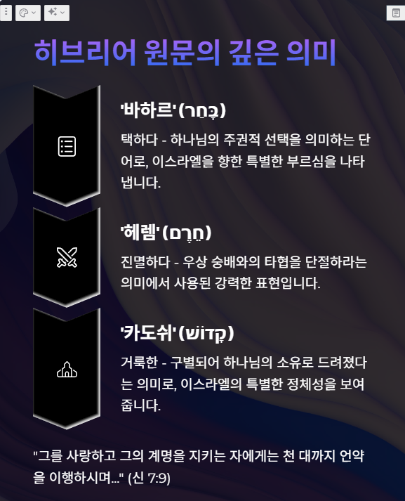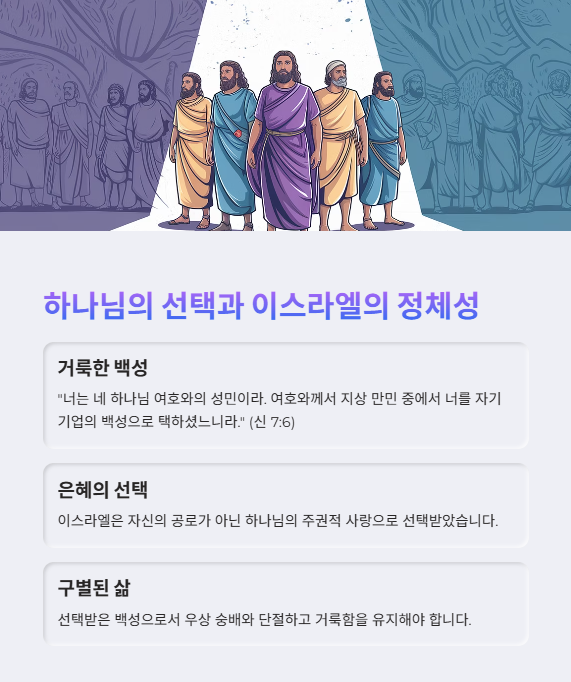 신명기 7장은 선민 사상의 근원이 되는 본문으로, 이스라엘의 정체성과 소명을 명확히 보여줍니다.