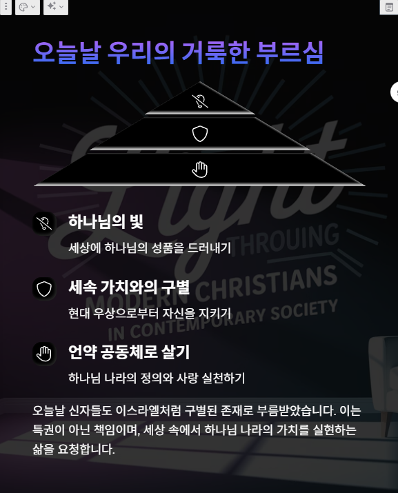 이 부르심은 단지 특권이 아니라, 하나님을 드러내는 삶, 우상과 세속의 가치로부터 자신을 지키는 삶을 요청합니다.