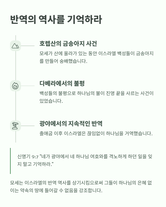 - 모세는 호렙산에서의 금송아지 사건을 포함하여, 이스라엘이 반복적으로 하나님을 거역한 사건들을 상기시킨다.