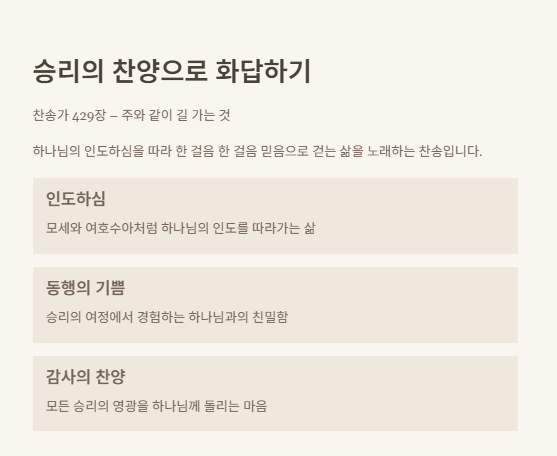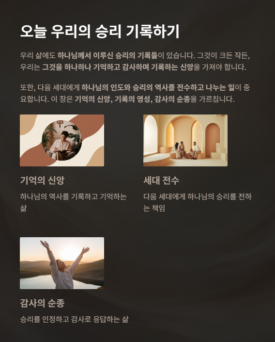 또한, 다음 세대에게 하나님의 인도와 승리의 역사를 전수하고 나누는 일이 중요합니다.