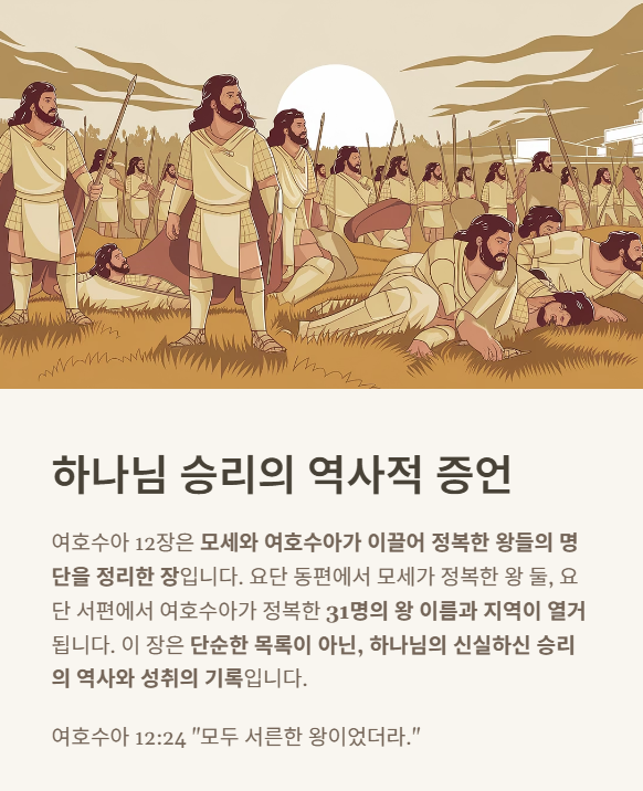 여호수아 12장은 모세와 여호수아가 이끌어 정복한 왕들의 명단을 정리한 장입니다.