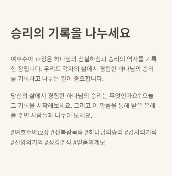 이 장은 단순한 목록이 아닌, 하나님의 신실하신 승리의 역사와 성취의 기록입니다.