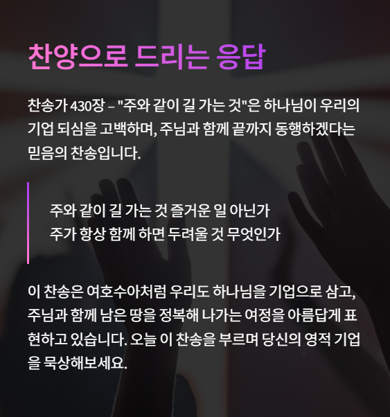 하나님이 우리의 기업 되심을 고백하며, 주님과 함께 끝까지 동행하겠다는 믿음의 찬송입니다.