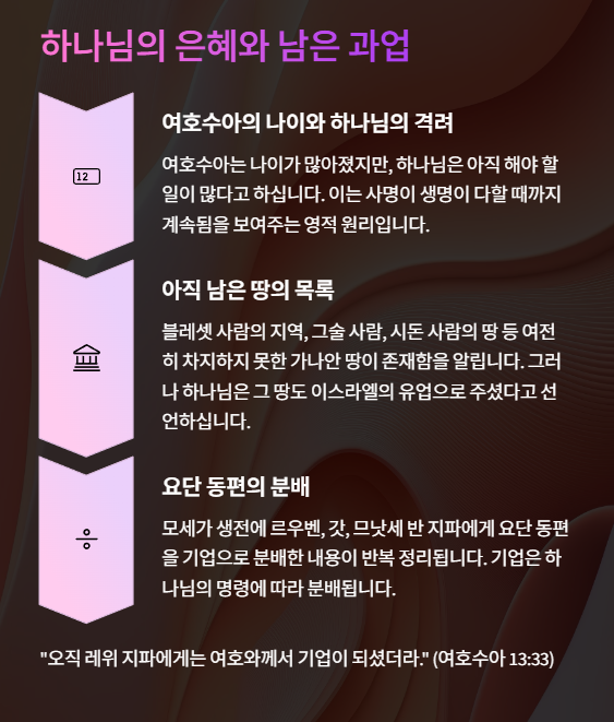 여호수아 13장은 이스라엘 땅 분배의 시작과 아직 정복되지 않은 땅의 목록을 기록하며,