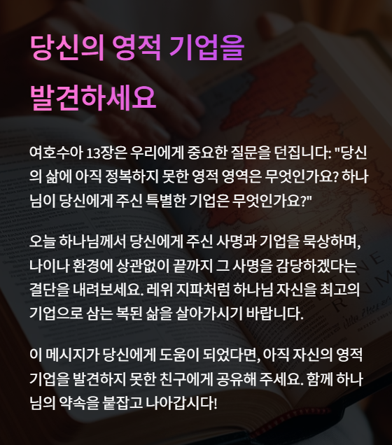 삶 속에서 아직 주님의 뜻이 이루어지지 않은 영역은, 믿음으로 차지해가야 할 남은 땅입니다.