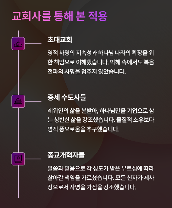 종교개혁자들은 이 본문을 통해 말씀과 믿음으로 각 성도가 받은 부르심에 따라 살아갈 책임을 가르쳤습니다.