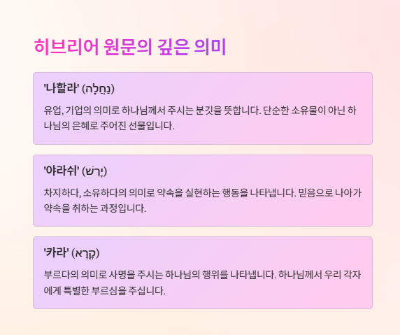 • ‘나할라’ (נַחֲלָה) – 유업, 기업. 하나님께서 주시는 분깃.