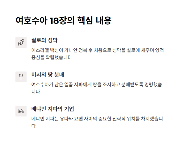 - 가나안 정복 후 처음으로 성막이 실로에 세워지며, 실로는 이후 중심 성소가 됩니다.