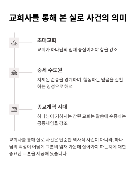 초대교회는 실로 사건을 통해 교회가 하나님의 임재 중심이어야 함을 강조했고, 중세 수도원은 지체된 순종을 경계하며, 행동하는 믿음을 실천하는 영성으로 이 본문을 묵상했습니다.