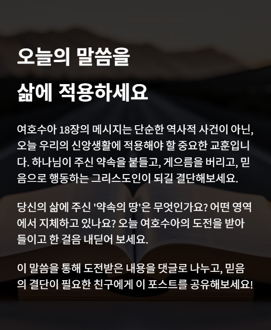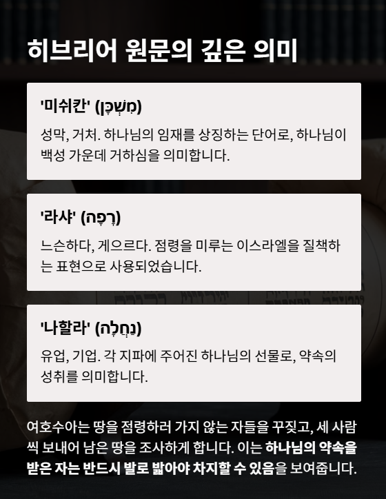 세 사람씩 보내어 남은 땅을 조사하게 합니다. - 이는 하나님의 약속을 받은 자는 반드시 발로 밟아야 차지할 수 있음을 보여줍니다.