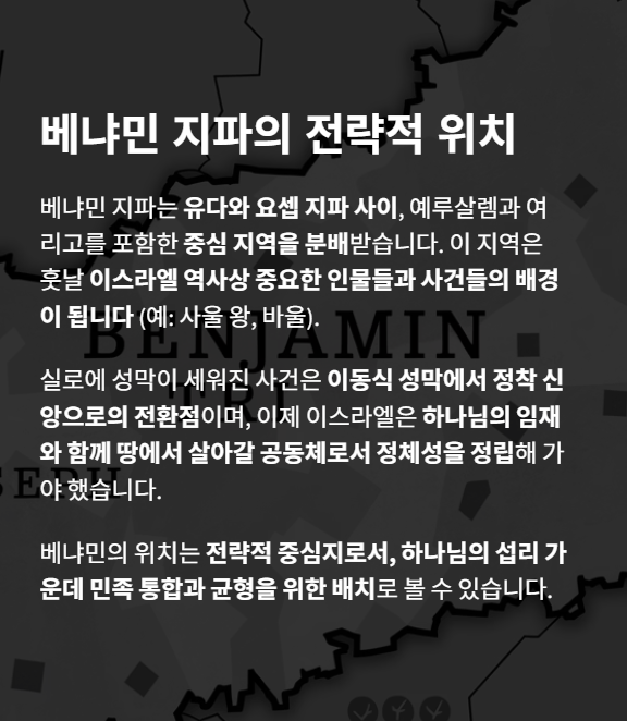 베냐민의 위치는 전략적 중심지로서, 하나님의 섭리 가운데 민족 통합과 균형을 위한 배치로 볼 수 있습니다.