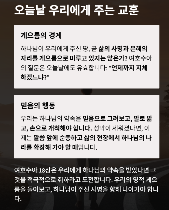 여호수아는 땅을 차지하지 않고 주저하는 지파들을 책망하며 분명한 행동을 요구합니다.