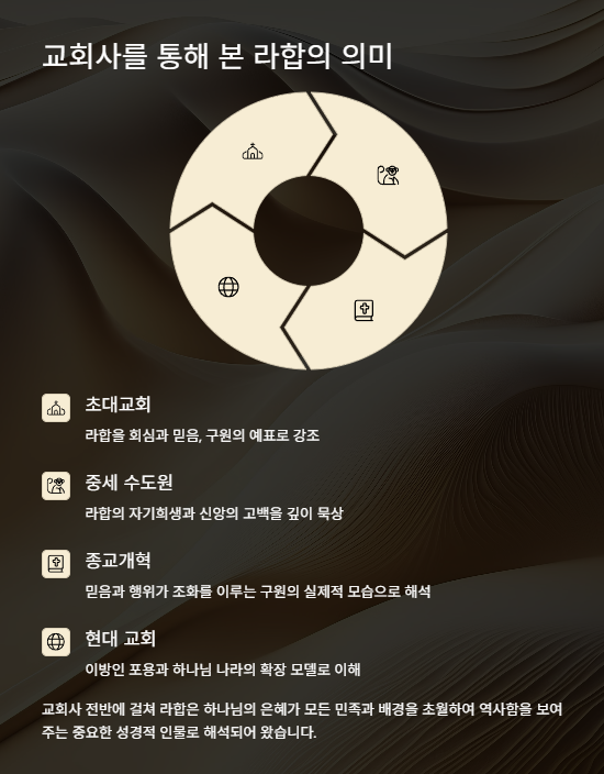 초대교회는 라합을 회심과 믿음, 구원의 예표로 강조했고, 중세 수도자들은 라합의 자기희생과 신앙의 고백을 깊이 묵상하며,