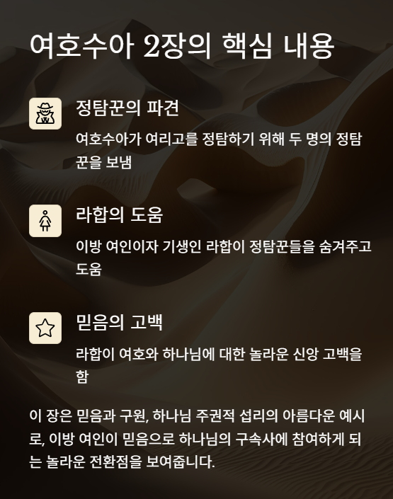 여호수아 2장은 여호수아가 여리고를 정탐하기 위해 두 명의 정탐꾼을 보내는 장면과,