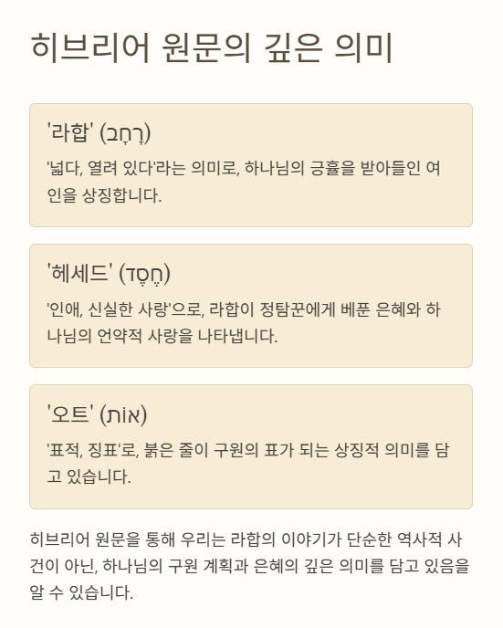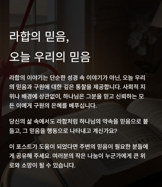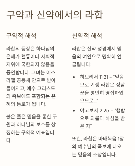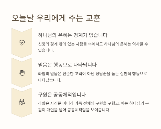 또한, 라합은 마태복음 1장의 예수님의 족보에 나오는 믿음의 조상입니다. 하나님은 가장 낮은 자를 들어 구속의 통로로 사용하십니다.