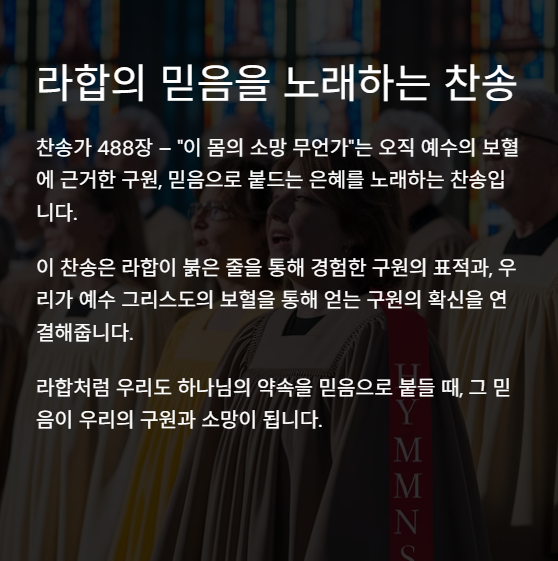 - 📖 히브리서 11:31 – "믿음으로 기생 라합은 정탐꾼을 평안히 영접하였으므로..."