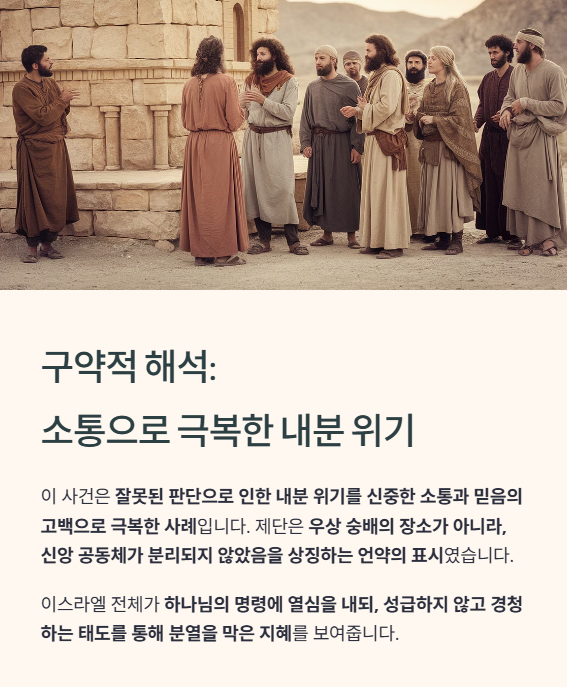 이스라엘 전체가 하나님의 명령에 열심을 내되, 성급하지 않고 경청하는 태도를 통해 분열을 막은 지혜를 보여줍니다.