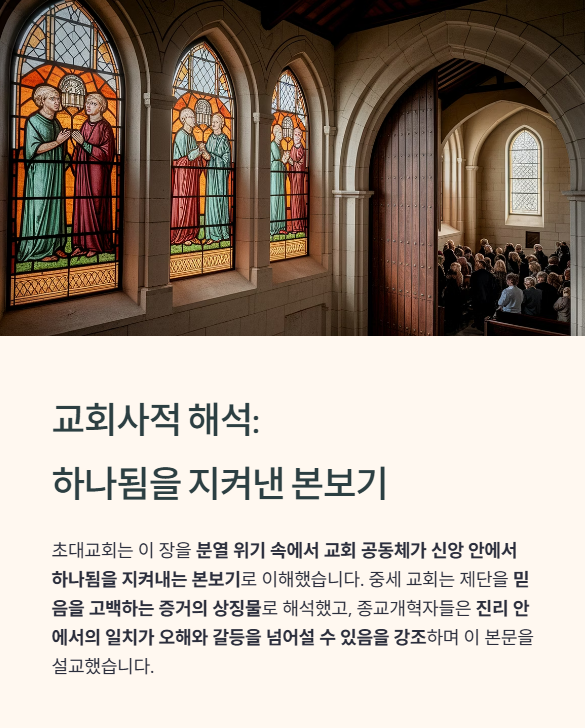 초대교회는 이 장을 분열 위기 속에서 교회 공동체가 신앙 안에서 하나됨을 지켜내는 본보기로 이해했습니다.