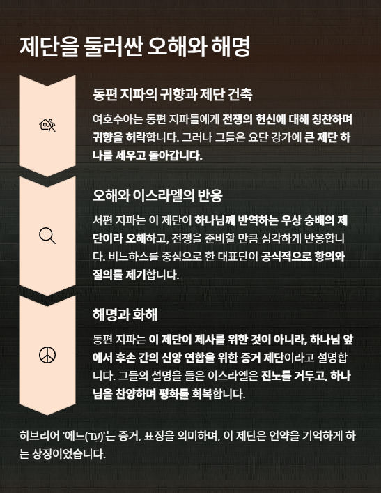 - 동편 지파는 이 제단이 제사를 위한 것이 아니라, 하나님 앞에서 후손 간의 신앙 연합을 위한 증거 제단이라고 설명합니다.