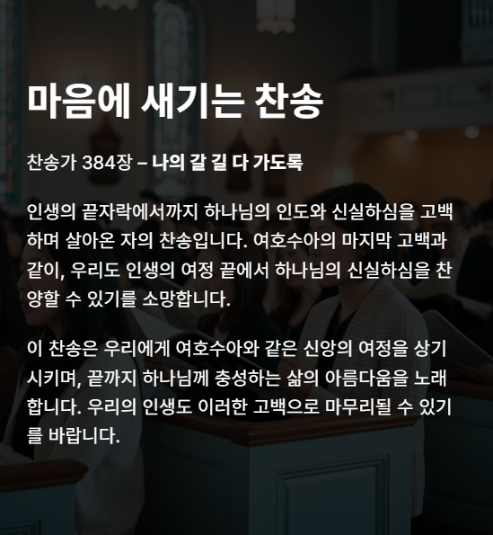 인생의 끝자락에서까지 하나님의 인도와 신실하심을 고백하며 살아온 자의 찬송입니다.