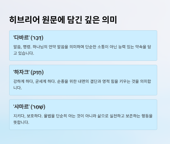 - ‘하자크’ (חָזַק) – 강하게 하다, 굳세게 하다. 순종을 위한 내면의 결단.