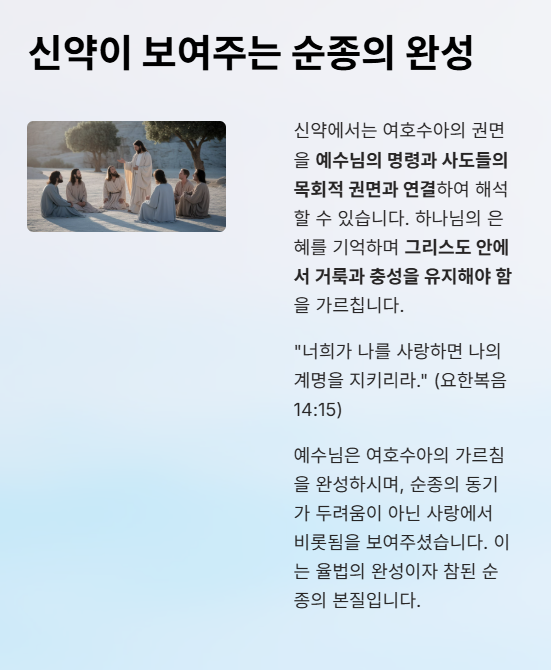 신약에서는 여호수아의 권면을 예수님의 명령과 사도들의 목회적 권면과 연결하여 해석할 수 있습니다.