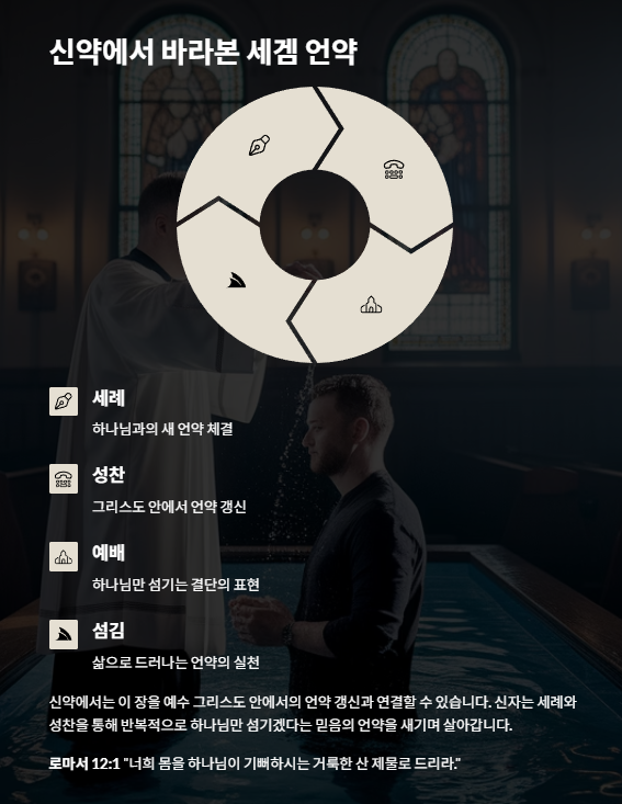 신자는 세례와 성찬을 통해 반복적으로 하나님만 섬기겠다는 믿음의 언약을 새기며 살아갑니다.