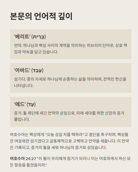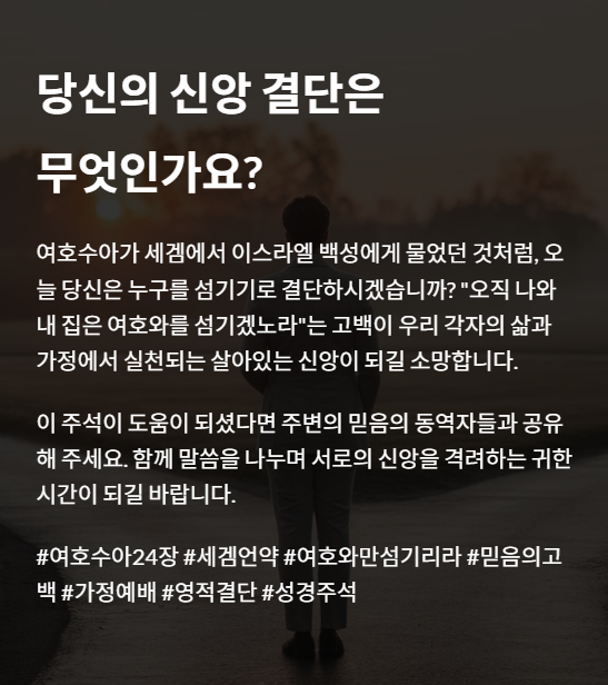 - 여호수아는 백성에게 "오늘 whom you will serve"(오늘 섬길 자를 택하라)라고 결단을 촉구합니다.