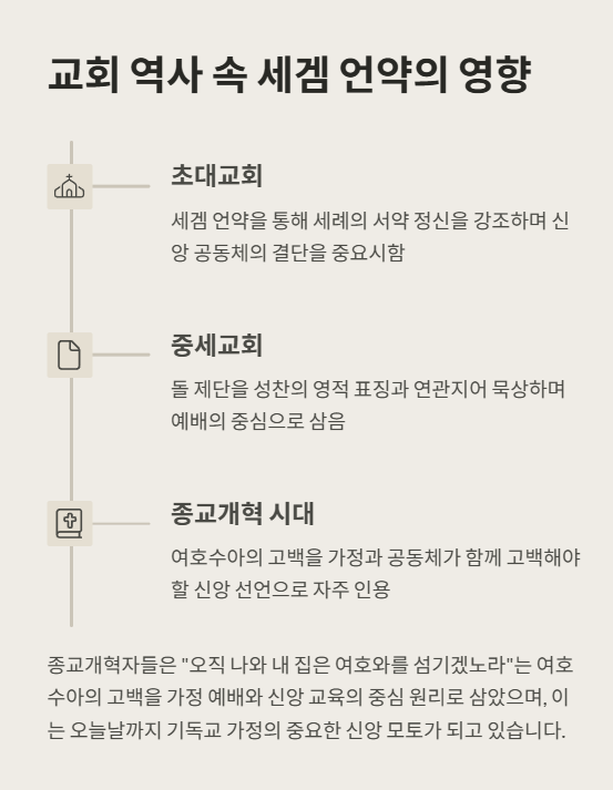 종교개혁자들은 여호수아의 고백을 가정과 공동체가 함께 고백해야 할 신앙 선언으로 자주 인용했습니다: “오직 나와 내 집은 여호와를 섬기겠노라.”