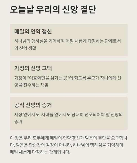 이 장은 우리 모두에게 매일의 언약 갱신과 믿음의 결단을 요구합니다.